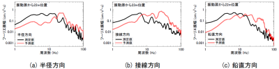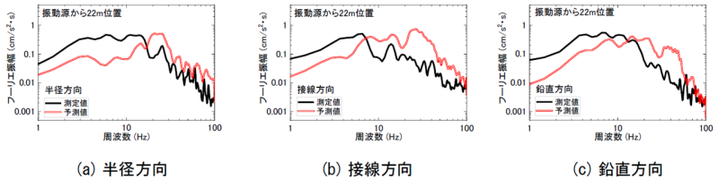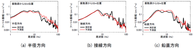 まず,振動源から22mの位置の予測結果(図4)では,測定記録のピーク周波数を再現できていないことがわかります.一方,振動源から32mの位置の予測結果(図5)では,1-100Hzの広帯域において周波数特性を概ね再現できています.これは,(1)式において表面波のみを考慮したことから,表面波が卓越する遠方の方が予測条件に近いためと考えられます.