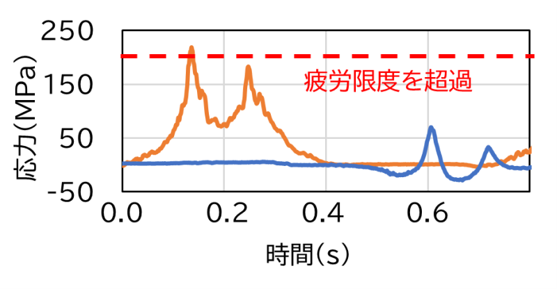 浮きまくらぎおよびレール頭頂面の局所的な凹凸が確認され,著大なレール底部曲げ応力が生じるような状態で使用されるレールを対象に応力測定を実施した結果(図2)や,軌道条件を模擬した数値解析の結果より,列車通過時にレールに生じる応力が健全な状態で生じる応力の数倍に達し,荷重が繰返し作用しても疲労破壊を生じない最大応力である疲労限度を超過して損傷を引き起こすことが明らかとなりました.
