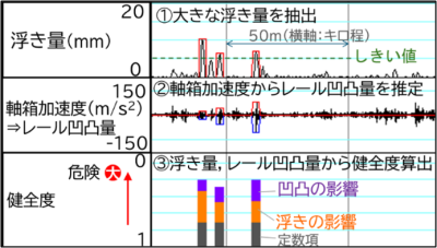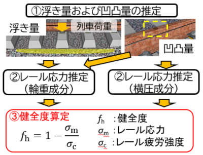 以上に示した知見に基づき,軌道変位や軸箱加速度といった軌道検測データより算定したまくらぎの浮き量とレール頭頂面凹凸量を用いて,数値解析により輪重および横圧成分それぞれに対応したレール発生応力を推定し,その結果よりレールの疲労限度と発生応力の比から求められるレール疲労健全度を推定する方法を提案しました(図3).レール疲労健全度は次式により求めることができます.