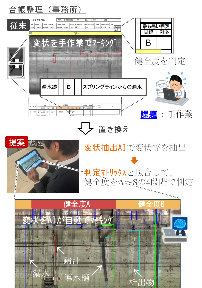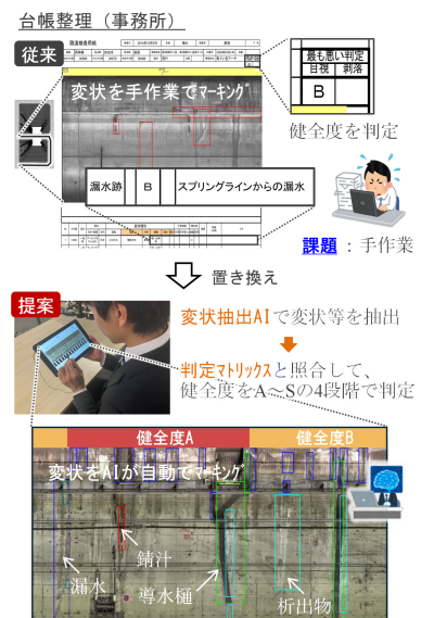 一つめは,トンネル覆工撮影画像から,AIを用いてひび割れ以外の変状や補修跡も検出し,トンネル全体の健全度の目安と,重点的に調査すべき要注意箇所を自動で抽出する「変状抽出・健全度判定アプリ」です(図1).
