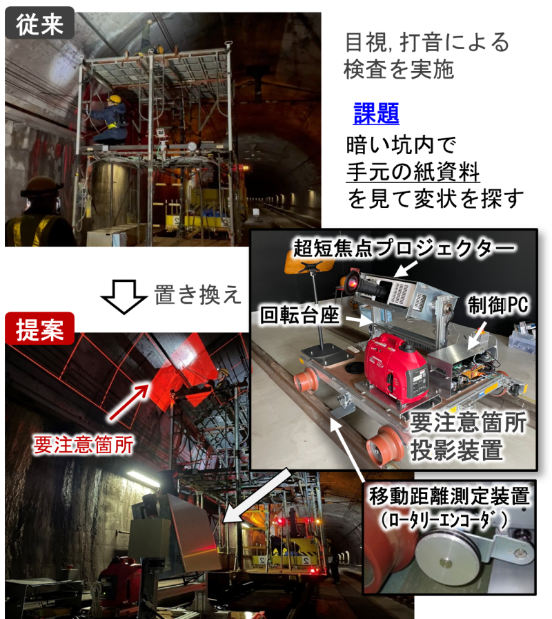 鉄道トンネルの定期検査業務の効率化を目的として開発したシステムのうち,要注意箇所投影装置の改良内容について紹介しました.今後も,本投影システムの適用拡大に向け,プロジェクターの小型化と分割投影の機能性向上に向けた検討を進める予定です.