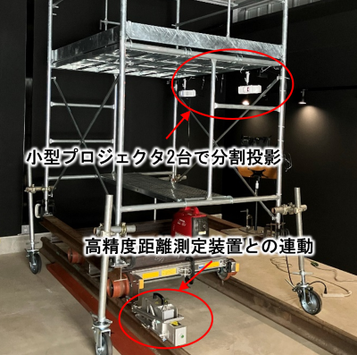 先述の投影装置は,軽便トロに装置一式を搭載しており,徒歩による検査を想定しておりました.しかしながら,作業車や高所台車を使用する事業者も多いことから,図3のように,軽便トロによらない投影装置への改良を実施しました.