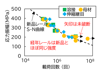 健全な状態で使用され,交換周期に達したレールの疲労特性を把握するため,現行の交換周期の通過トン数である10億トン程度に達した溶接部,母材,および伸縮継目部より収集した経年レールを対象に,実レールの疲労試験および載荷回数が5億回(通過トン数:50億トン相当)の回転曲げの疲労試験を実施しました.その結果,経年レールの疲労試験結果は新品レールのS-N曲線と比較して疲労強度の減少がほとんど見られず(図1),健全な状態で使用されていれば10億トンを超える長期の使用,さらには交換周期の撤廃も可能であることが明らかとなりました.