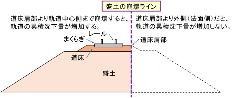 近年,台風や集中豪雨によって鉄道盛土が被害を受ける事例が増加しています.被災した盛土における列車の繰返し通過によって生じる軌道の累積沈下については,これまでに1/5縮尺の盛土模型上に設置した1/5縮尺のバラスト軌道模型を用いた繰返し載荷試験が実施されています.試験の結果から,盛土の崩壊範囲が道床肩部よりも軌道中心側に達しない場合には,軌道の累積沈下量が増加しないことが確認されました(図1).また,崩壊範囲がまくらぎ端部まで達した場合であっても,大型土のうによる応急復旧により,盛土の崩壊領域が道床肩部まで達しない場合と同程度まで軌道の累積沈下量を抑制できることが確認されました1).
