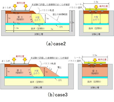 繰返し載荷試験における載荷位置は中央のまくらぎのレール上とし,繰返し荷重は最小5kN,最大165kN(荷重振幅160kN)としました.載荷周波数は5Hzとし,各試験ケースの載荷回数は50万回としました.図3に各試験ケースにおける実物大模型を示します.まくらぎ両端部,盛土天端および盛土のり面部に変位計を設置して変位を計測しましたが,本稿では崩壊側における中央のまくらぎ端部における載荷時の変位および変位振幅について紹介させていただきます.