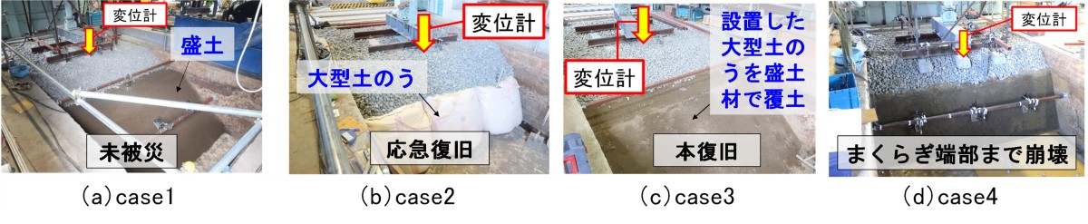 case2ではまくらぎ端部まで盛土を掘削して撤去し,大型土のうを線路方向に3体並べて設置しました.大型土のうには,ポリプロピレン製の大型土のう袋を用いており,その袋の中に稲城砂を投入して盛土の構築と同じ乾燥密度1.572g/cm3となるように締め固めて作製しました.case3ではcase2の試験後に設置した大型土のうを撤去せずに,未被災時の盛土形状となるように覆土しました.case4ではcase2およびcase3で施工した土のうや覆土を全て取り除きました.