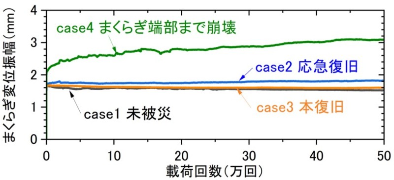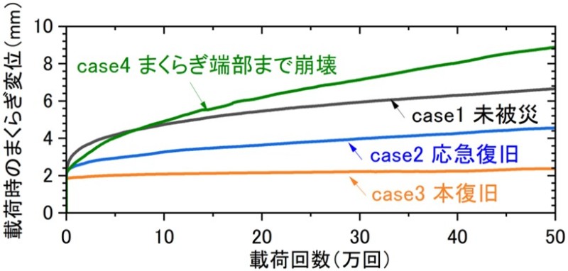 図4に崩壊側におけるまくらぎ変位(載荷時)を示します.ここで,各ケースのまくらぎ変位は各載荷前を0mmとしました.崩壊側の載荷50万回時のまくらぎ変位は,case4(まくらぎ端部まで崩壊),case1(未被災),case2(応急復旧),case3(本復旧)の順で小さくなりました.case1~case3のまくらぎ変位はcase4よりも小さいことから,応急復旧・本復旧が軌道沈下を抑制する効果を有していると考えられます.なお,試験ケースがcase1からcase3へと進むにつれて,まくらぎ変位が小さくなりました.この要因としては,前の試験ケースにおける載荷履歴の影響により,バラスト道床が締め固められたことが考えられます.