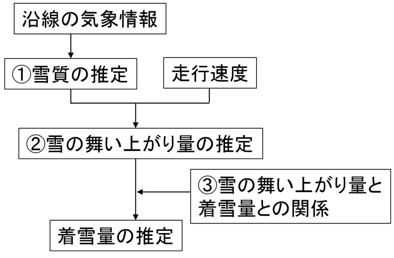 車両着落雪推定手法は,沿線の気象情報,明かりやトンネルの施設情報,列車の運行情報から明かり区間での着雪の成長と温暖なトンネル内での落雪の発生位置を推定可能な手法です.明かり区間では,沿線の気象情報から,①軌道上の積雪表層の雪密度を推定し,②雪密度に応じた雪の舞い上がり量を推定し,③雪の舞い上がり量と着雪量との関係から着雪伸長量(フサギ板から着雪先端までの長さ)を推定します3)(図1).