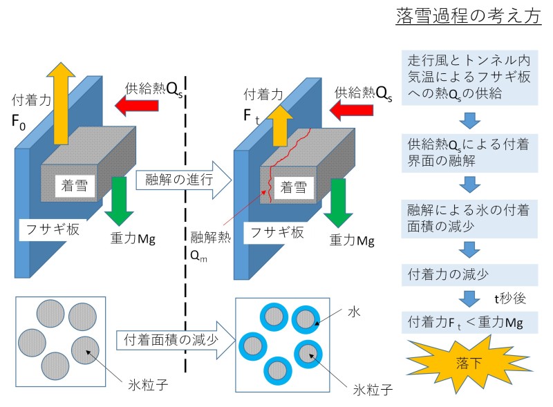 長いトンネルは,冬期に外気温がマイナスでも暖かいため,着雪したフサギ板にはプラスの気温の走行風により熱が供給されます.供給熱により,着雪表面の融雪やフサギ板と着雪との界面の融雪が発生し,着雪に働く重力よりも界面における付着力が小さくなると落雪が発生すると考えられます4)(図2).