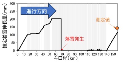 計算区間を100m毎に分割し,車両着落雪推定手法により計算した着雪伸長量の変化を図3に示します.図中の灰色の網掛けはトンネル区間を表します.明かり区間で着雪が成長し,長いトンネルで落雪が発生することが計算されていることがわかります.グラフの右端は,着雪伸長量を測定している駅で,一冬期分の測定値と推定値を比較した結果,約30mmの誤差で着雪伸長量を推定可能なことを確認しています.