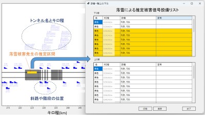 車両着落雪推定手法では,トンネル内における落雪の発生位置と落雪時の着雪伸長量を推定することが可能です.そこで,落雪による信号設備の破損を対象として,前回の点検日から当該点検日までの着落雪計算結果を用いて,落雪の発生キロ程と落雪発生時の着雪伸長量に応じて,落雪による被害発生の推定区間とその区間の信号設備のリストを色分け表示するツールを開発しました(図4).本ツールには,点検時の計画が立てやすいようにトンネル坑口位置や斜路や階段の位置のキロ程を併せて表示します.信号設備を例として示しましたが,データベースを入れ替えることにより,他の施設(例えば温水ジェットノズルなど)についても表示することが可能です.
