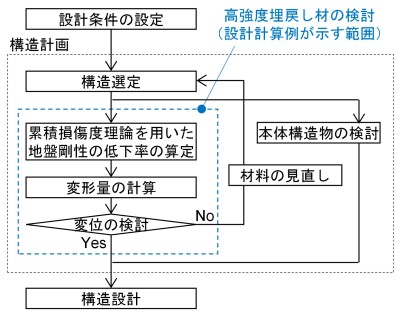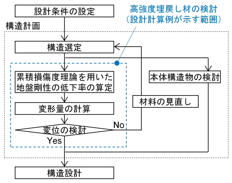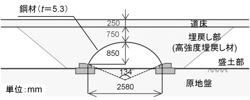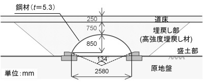 『線路下アーチカルバートの設計計算例(開削工法・高強度埋戻し材併用)【暫定版】』をとりまとめました.本設計計算例では,盛土中に建設される幅2580 mm,アーチライズ850 mmのコルゲートアーチカルバート(図2)を対象とし,地震時以外の設計において,適切な地盤剛性を有する高強度埋戻し材を選定する流れ(図3)を示しています.具体的には,高強度埋戻し材を用いた背面地盤の地盤剛性の低下率を「累積損傷度理論」1)と呼ばれる手法で算定し,この低下率を考慮したはりばねモデルによりカルバート本体の変位量を求めて,許容値と比較します.