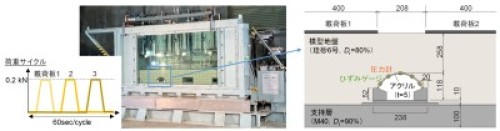 繰返し載荷に伴う地盤剛性の低下の模式図を図4に示します.一様な地盤においては,繰返し載荷に伴って累積ひずみγp1が発生することが知られています.累積損傷度理論では,累積ひずみγp1を,土中の初期応力,繰返し載荷時の応力変動,および繰返し回数等を入力条件として,繰返し載荷に伴う地盤剛性の低下率を算定することができます.本研究では,土中に薄肉アーチカルバートが存在する場合の,この理論の適用性について模型実験を行って検証しました.