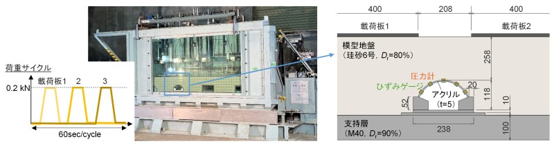 実施した模型実験の概要を図5に示します.模型地盤は,珪砂6号(目標相対密度80%)で作製し,アーチ模型の仕様は,実際のコルゲートアーチカルバートの適用事例を参考にして設定しました.ただし,実物よりもアーチ模型の剛性,模型地盤の初期剛性を低く設定し,また,載荷荷重を大きく設定することで,地盤剛性の低下が促進される条件としました.なお,載荷はアーチ模型の水平方向の繰返し変形が卓越するように,斜め両側からとして,静的に1000 cycle実施しました.
