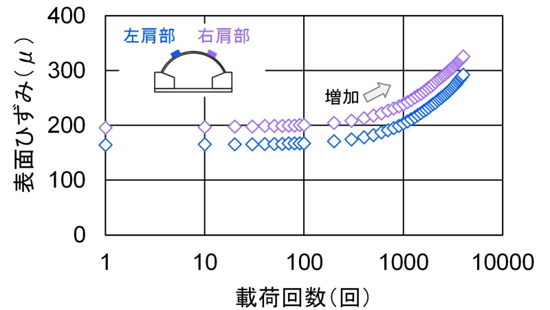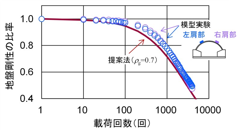従来は,アーチカルバートの寸法や地盤条件に関係なく,経験的に一律の地盤強化対策が講じられてきましたが,より合理的な設計のため,地盤剛性の低下が生じない埋戻し材を定量的に選定できる手法の確立も求められていました.そこで本研究では,模型実験を通じて累積損傷度理論を用いた地盤剛性の低下率の算定法を提案し,設計計算例にとりまとめました.