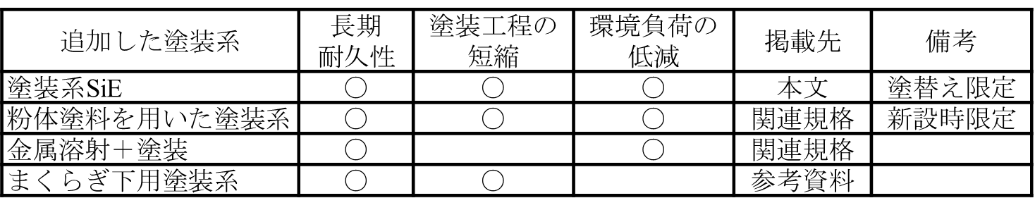 その他の3種類の塗装系の詳細はここでは割愛しますが,使用する材料が従来の塗料性状と大きく異なることや,現場での施工実績が少ないことなどを踏まえて,関連規格や参考資料に追加しました.今後,各塗装系の使用実態を調査し,掲載先や記載内容を精査していく予定です.