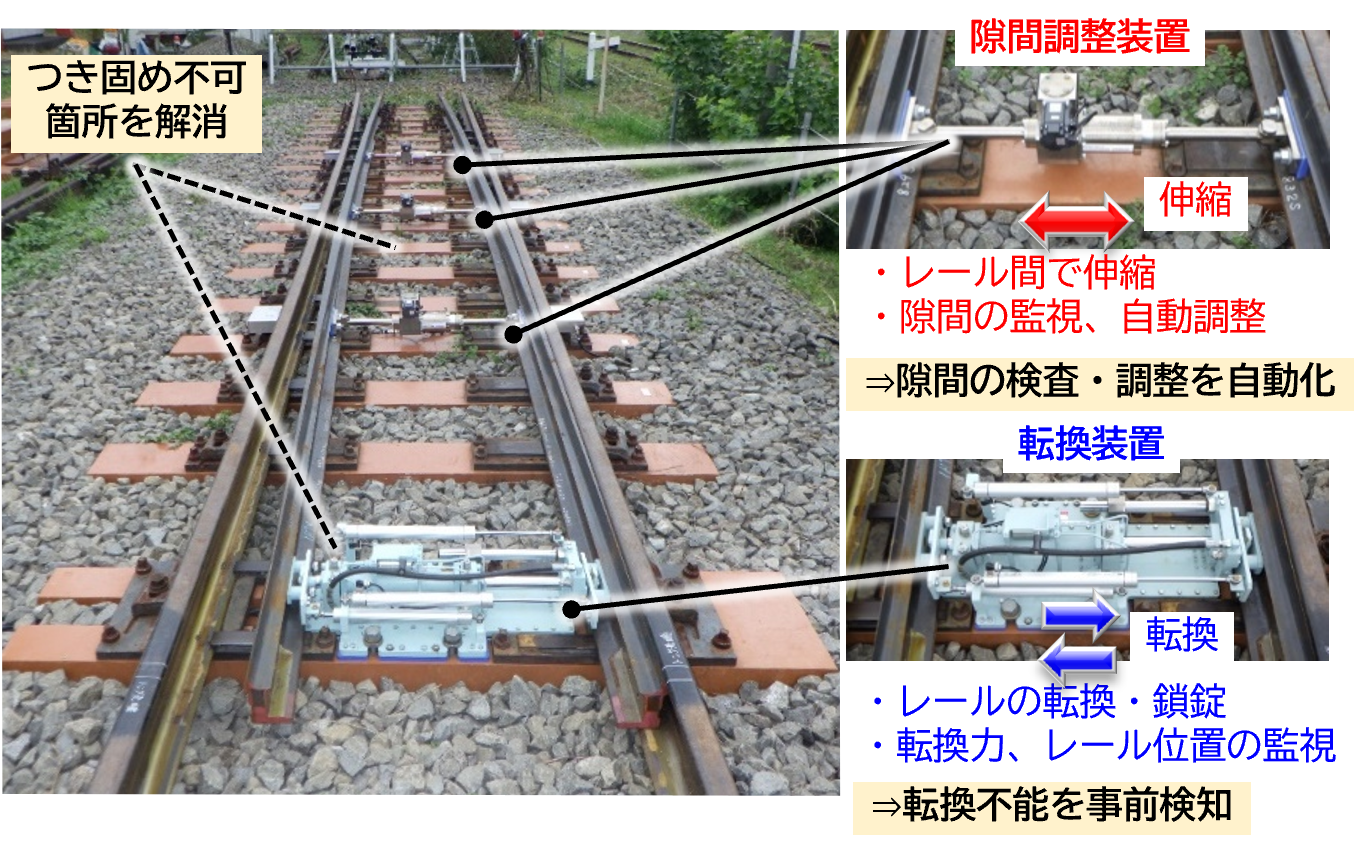 図2に提案する分岐器ポイントを示します.本分岐器ポイントは,既存の電気転てつ機を転換装置1台に置き換え,控え棒を3台の隙間調整装置に置き換えることで,①バラストのつき固め不能箇所を解消する,②トングレールと基本レールおよび止め金具の隙間の検査と調整作業を省力化する,③転換不能の事前検知を可能とする,という観点から保守の省力化を図ったものです.この①~③を達成するために開発した転換装置と隙間調整装置を図3と図4に示します.