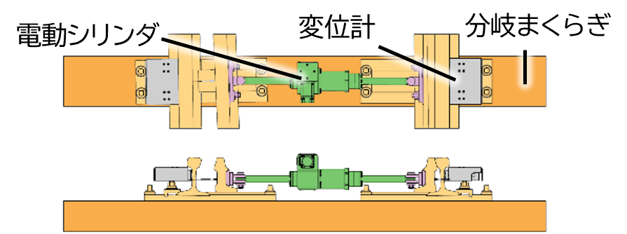 隙間調整装置は,電動シリンダの伸縮により,トングレールと基本レール・止め金具間の隙間を調整する装置になります.本装置は,左右のトングレールに取り付けることで,控え棒を撤去し,バラストのつき固め不能箇所を解消しています.また,トングレールと基本レール間の隙間をモニタリングし,転換後に自動伸縮することで,各部の隙間の検査と調整作業を自動化します.