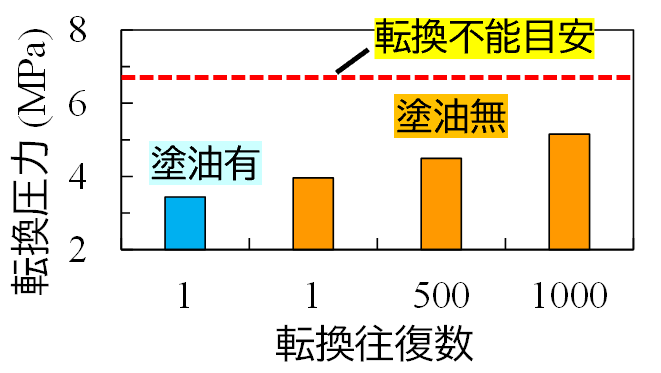 製作した転換装置と隙間調整装置を12番分岐器の試験用ポイントに敷設し,機能確認試験を行いました.まず,床板に塗油した状態と,塗油が無い状態で最大1000往復の転換動作を行い,塗油の有無および転換回数の増加に伴う転換圧力の変化を評価しました(図5).結果として,転換圧力は,塗油無しが塗油有りよりも大きく,さらに,転換回数の増加に伴い増加していることが分かります.ここで,転換装置の転換力の設計目標値は,圧力に換算して6.7MPaとなるため,この圧力値を目安値として転換圧力を監視することで,転換不能を未然に防止することが可能となります.