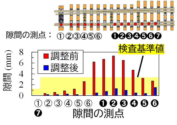 続いて,試験用ポイントにおいて,隙間調整装置3台を動作させ,隙間調整機能が有効か否かを確認しました.ここでは,床板への塗油の有無や,止め金具の隙間を変化させた条件を設定したうえで,提案した制御方法1)に基づき,隙間調整装置3台を自動伸縮させています.図6に隙間調整前後における各部の隙間の測定結果の一例を示します.図中には,隙間の検査の判定基準値(トングレールの先端から500mmの範囲が隙間1mm以下,これよりも後方が隙間3mm以下)を示しています.本試験より,床板の塗油の有無や止め金具の隙間を変化させた様々な条件において,必要なFW幅70mmを確保したうえで,全測点の隙間を検査基準値内に調整できることを確認しました.