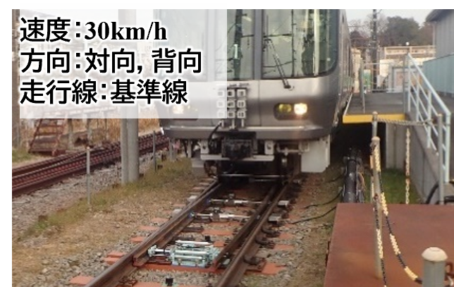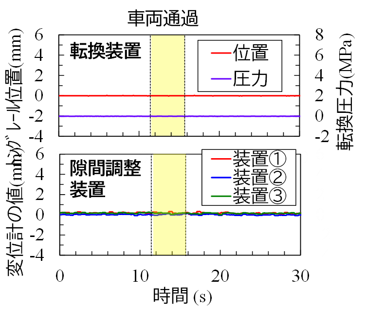 次に,開発した転換装置と隙間調整装置を所内試験線の60kgレール用8番分岐器の弾性ポイントに敷設し,分岐器上を試験車両が走行した際の装置の異状の有無を確認しました.図7に試験車両が走行した際の状況を,図8に車両が通過した際の転換装置および隙間調整装置の出力値を示します.走行試験の結果,車両通過時に転換装置が出力する転換圧力,トングレール位置および隙間調整装置が出力する変位計の値に変動は認められず,車両通過後の各装置の動作にも異状がないことを確認しました.