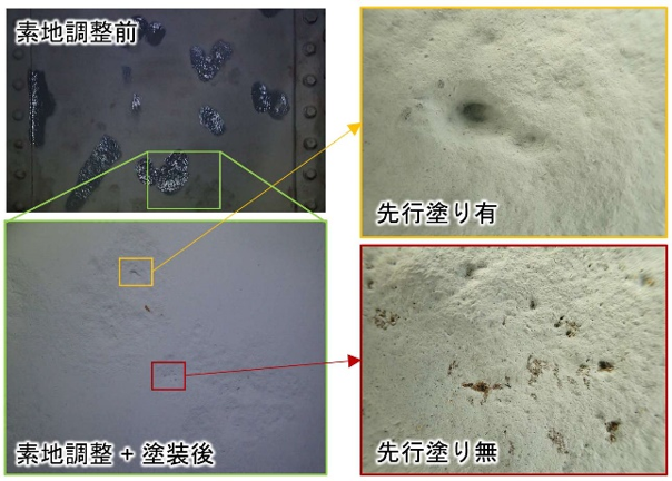 また,実橋梁での早期腐食箇所の調査結果から,刷毛塗りによる先行塗りの記載を追加しました.これは,過去の腐食により部分的に減肉した箇所では表面が平坦でなく,一般的な塗装器具であるローラで塗装する前に刷毛を用いた先行塗りを実施することで細部に至るまで塗料が供給され,より均一で連続性のある塗膜が形成されることが確認されたことによります(図2).