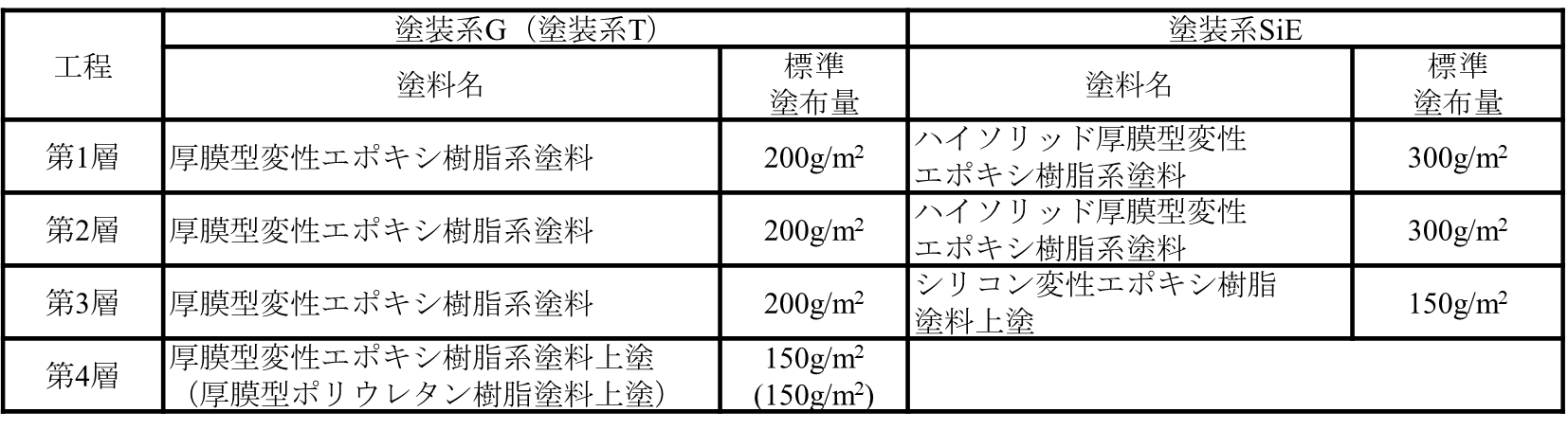 今回の改訂では,省力化,省コスト化,環境対応を念頭に4種類の塗装系を新規に追加しました(表1).その中でも塗装系SiEは多くの鋼構造物での適用が見込まれる塗装系です.塗装系SiEは従来の塗料と比較して有機溶剤の使用量が少なく厚膜施工が可能なエポキシ樹脂塗料を採用しています.このため,現在主に使用されている塗装系G,Tに比べて,指定化学物質量を約28~57%,VOC(揮発性有機化合物)量を約43~54%削減可能といった環境に配慮した仕様であるとともに,塗装工程を4回塗りから3回塗りに短縮しています(表2,3).また,室内促進試験から,塗装系SiEの防食性能は塗装系Tと同等であることを確認しました.さらに,複数の実橋梁において施工試験を実施し,塗膜変状の発生が確認されないほか,塗装系G,Tと同等の作業性であることも確認しました.