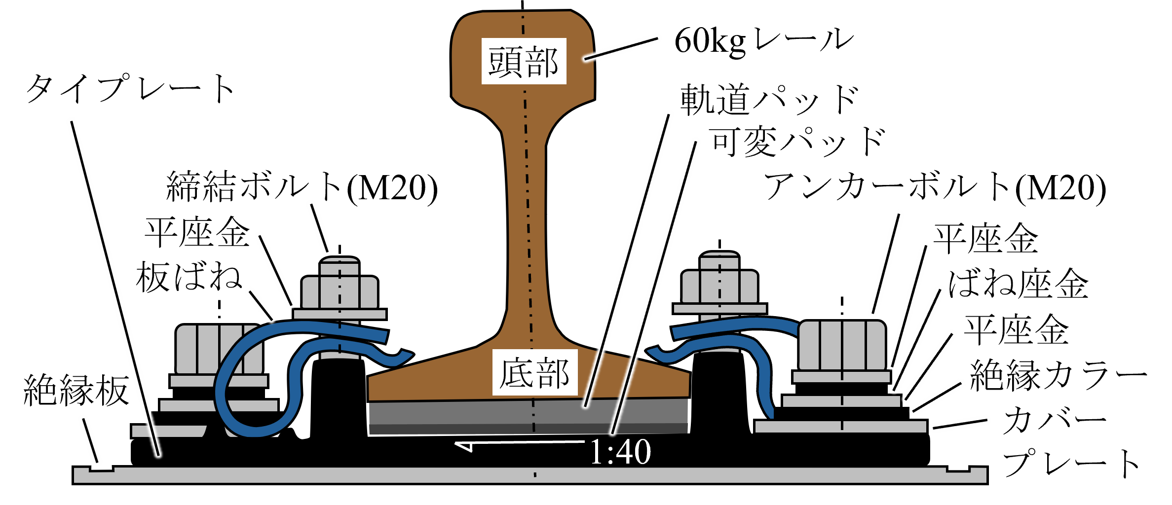 本試験の対象は,近年の整備新幹線で主に用いられる直結8形レール締結装置改(低)形です.図1に締結装置の構成図を示します.締結装置は主に締結ボルト,板ばね,タイプレート,軌道パッド,可変パッドで構成され,締結ボルトと板ばねによりレールがタイプレートに,アンカーボルトによりタイプレートが軌道スラブに固定されます.なお,軌道スラブはA形軌道スラブ(A-55M)を用いました.