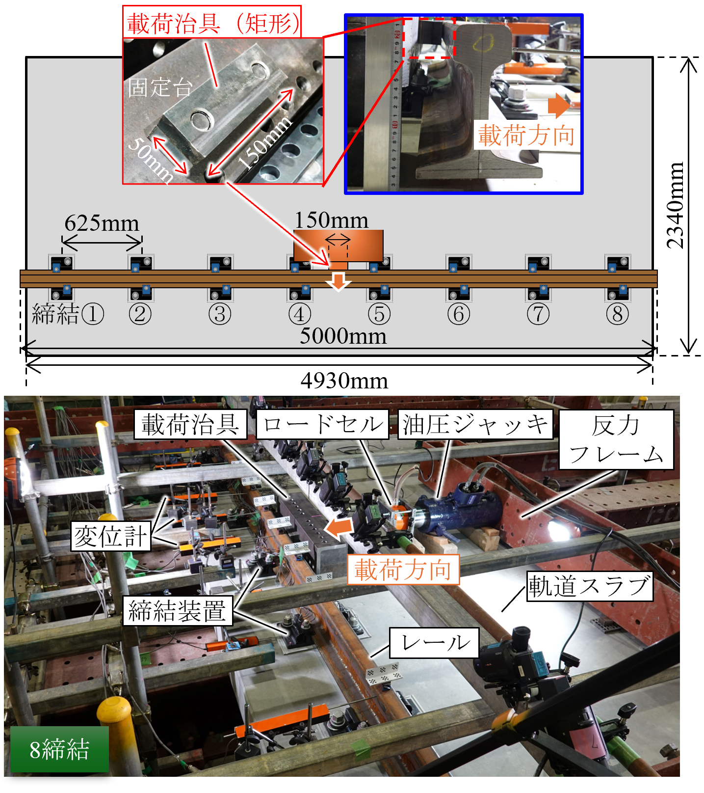 載荷方法は地震時の車両からの横圧を想定したレール頭部への静的水平載荷としました(図2).載荷には矩形(幅150mm×高さ50mm)の載荷治具を用い,反力フレームに固定した油圧ジャッキにより載荷を行いました.