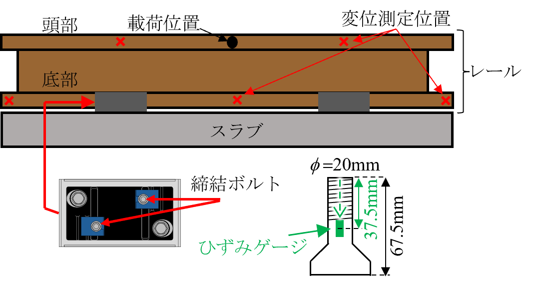 図3に載荷位置と測定位置の概要図を示します.載荷位置は締結間中央とし,変位の測定位置は,載荷面とは反対側のレール頭部,レール底部としました.また,締結ボルトにひずみゲージを貼付しました.締結ボルトは,ボルト中心部に2mmの穴あけ加工後,図3示すように削孔方向から深さ37.5mmの位置にひずみゲージを埋め込みました.各ボルトについては事前に引張試験を行い,ひずみから軸力を推定するための校正係数を求めています.