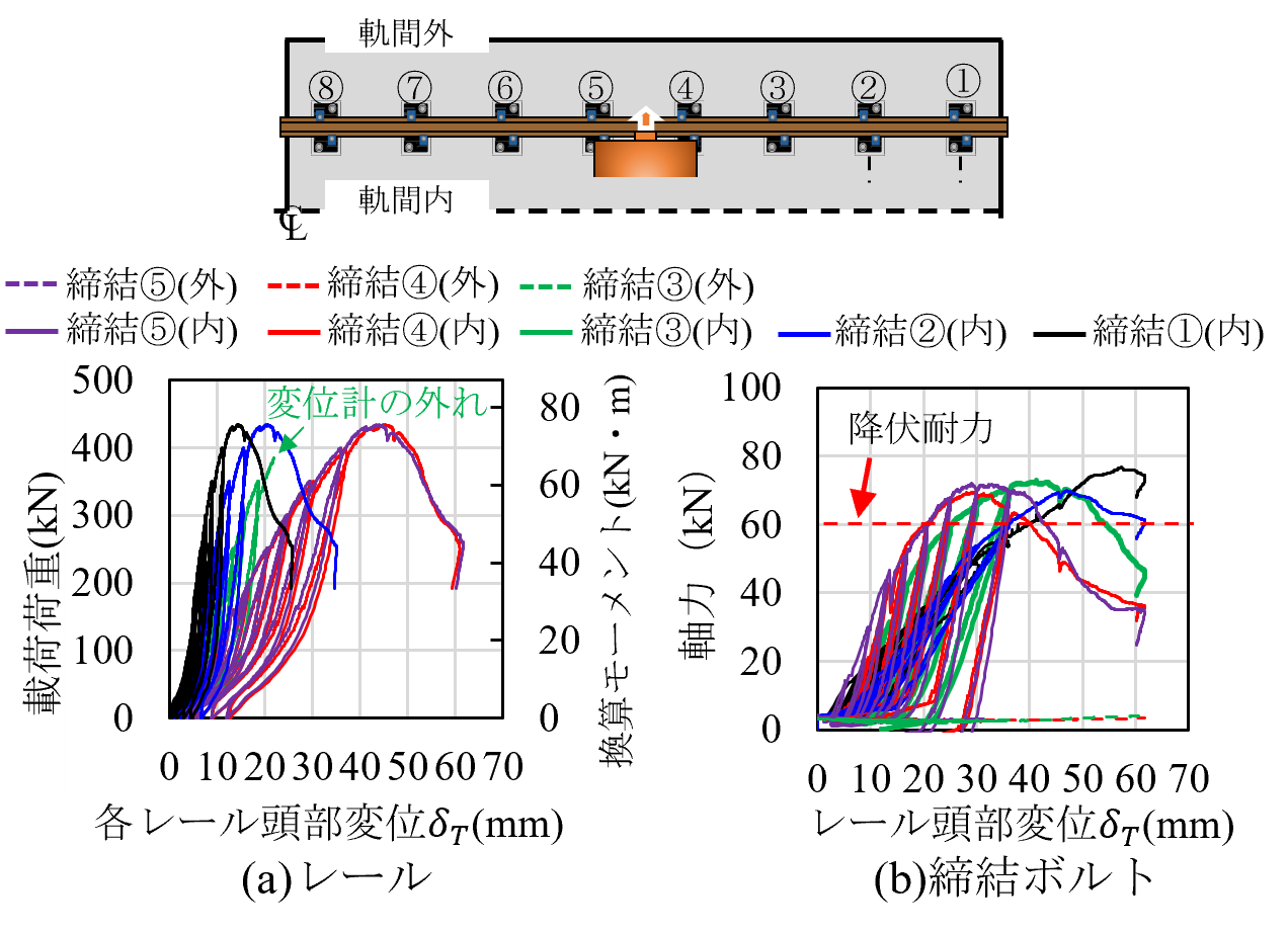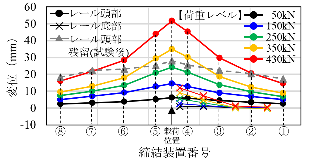 図4(a)に,載荷荷重と各締結装置位置におけるレール頭部の変位を示します.図4(a)の横軸は締結装置①~⑤におけるレール頭部の変位を示し,全ての締結装置において載荷荷重の増加に比例し,レール頭部の変位が増加することが確認できます.また,最大荷重から軌道部材の耐荷力は430kNであることを確認できます.