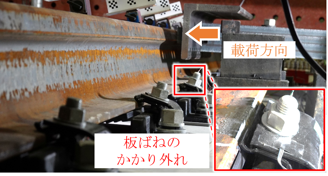 図4(b)に,レール頭部の変位と締結ボルトの軸力関係を示します.軌間内側で載荷位置中心に近い締結ボルトから軸力が増加し,変位15~20mmで降伏耐力に達することが確認できます.また,各締結ボルトの軸力は70kNに到達以降は徐々に低下する傾向にあり,それが載荷位置に近い締結ボルトから遠い締結ボルトに向かって順番に発生しました.なお,最終的な破壊形態は,図5に示すように載荷位置付近のレールが板ばね(締結装置⑤)から外れる脱離現象によるものでした.