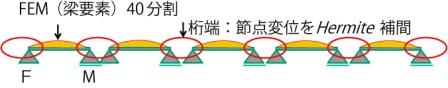図-3に構造物の半正弦波力学モデルの概念図を示します.半正弦波モデルでは,桁のたわみ形状を半正弦波に固定してモデル化しました.ただし桁の両端の角折れに対しては,弾性床上の梁の理論式に基づく緩和区間を設けました.