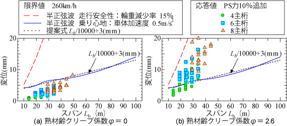 提案した限界値を用いて外ケーブル補強の高速鉄道PC桁への適用性について検討しました.ここでは,新幹線の70種類の標準桁を検討対象としました.検討では,有効プレストレス力の10%を外ケーブル補強により新たに付与すると仮定して,PC桁の上反り量を求めました.また,外ケーブル補強を実施する直前,軌道は水平に整備されていると仮定しました.熟材齢のPC桁のクリープ係数は,十分な実証データが得られていないため,クリープ係数φ=0と,新設設計のφ=2.6を用いました.