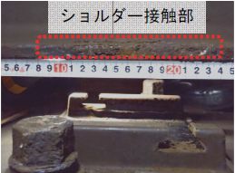 図2にレール底部側面の状態を示します.レール締結装置のタイプレートと接触している範囲において防食塗膜の損傷と腐食の進行が認められました.これは,列車荷重が作用した際にレール横圧力を受けるタイプレートのショルダー部に繰り返し押しつけられることで防食塗膜が損傷し,腐食が進行したものと考えられます.