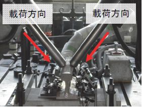 室内試験は,現地と同種のレール締結装置に防食処理を施したレールを固定して実施しました.試験方法は,擦れによる塗膜損傷の再現を加速するため2軸での繰返しの斜角載荷としました.図5に試験状況を示します.試験荷重は,レール締結装置の設計荷重を参考とし,1締結に作用するレール圧力,レール横圧力を算出しました.ここで,防食塗膜の損傷がレール締結部で生じる擦れに起因していることを考慮して,横圧はしばしば発生する最大荷重であるB荷重相当(30kN)とし,輪重は平均荷重であるC荷重相当(75kN)としました.表2に試験荷重条件を示します.試験では,10万回載荷毎に試験機を停止し,防食塗膜の損傷状態の変化を観察しました.