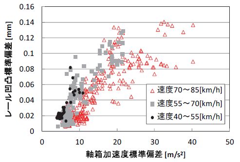 軌道検測車などで測定されている軸箱加速度については,波状摩耗に対して高い相関があること等がわかっており,これまでに軌道保守管理への活用法の検討が行われてきました.しかしながら,走行速度や加速度計の取り付け位置の違いにより,同じレール凹凸量上を走行しても軸箱加速度の値は変化するため,軸箱加速度を管理指標として活用している事業者は少ないのが現状です.