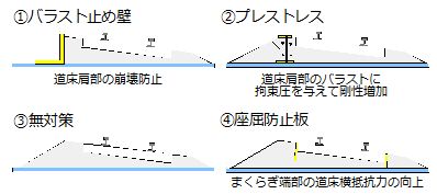 以上より,座屈防止板は,加振前の道床横抵抗力が無対策の2倍程度であったことから,正弦波800galまでまくらぎ変位の急増を抑制し,正弦波900galでも無対策の正弦波700galより小さいまくらぎ残留変位に抑制する効果を発揮したものと考えられます.バラスト止め壁は加振前の道床横抵抗力が無対策の1.5割増し程度でしたが,正弦波800galまでは座屈防止板と同程度の変位抑制効果を発揮しました.これは,バラスト止め壁が道床肩部を拘束することで,加振中の道床横抵抗力の低下を抑制したことによるものと考えられます.また,正弦波900galにおいてまくらぎ残留変位は急増しますが,無対策に比べて十分な変位抑制効果が発揮されているものと考えらます.