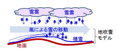 降雪分布を推定するためには、上空からもたらされる降水量に加えて、地表面付近の風による雪の移動量(地吹雪収支量)を推定する必要があります(図3参照)。ここでは、地吹雪収支量を推定する地吹雪モデルについて紹介します。