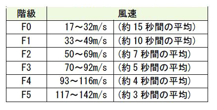 Fスケールの各階級はF0,F1のように表され,数値が大きくなるほど突風の規模が大きいことを示します(表1).Fスケールの各階級に風速が対応づけられており,階級ごとに風速の平均化時間が異なります.JEFスケールもFスケールと同様に,JEF0,JEF1のように表され,数値が大きくなるほど突風の規模が大きいことを示しています(表2).FスケールとJEFスケールは継続性を持たせるため,FスケールでF1と評定された現象はJEFスケールでも基本的にはJEF1とするなど,突風の規模の評定結果が両方のスケールでできる限り同じ階級となるように定められています.