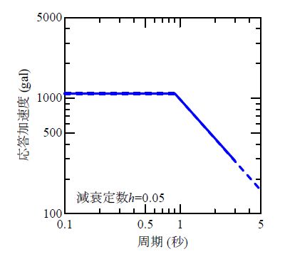 この時、耐震標準では“建設地点およびその周辺に活断層が知られてない場合においても、伏在断層による地震が直下で発生する可能性に配慮するものとする。この伏在断層による地震動をL2地震動の下限値として設定するものとする。”とあり、強震動予測手法による地震動を下限地震動と比較を行う必要があります。しかしながら、耐震標準では下限地震動の弾性加速度応答スペクトルが規定されている(図1)ものの,時刻歴波形やその他の情報は明記していませんでした。そこで、スペクトルI、スペクトルIIと同様の手順によって下限地震動を用いた耐震設計が可能となるように、時刻歴波形、地表面地震動等を作成しました。