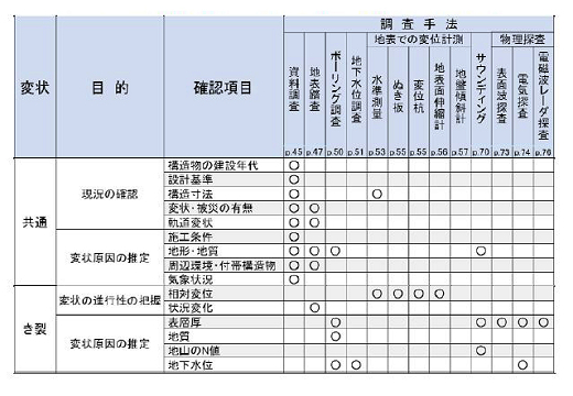 3章では、盛土、切土、自然斜面、トンネルの変状について、調査目的に応じた地質・地盤調査法を検索できる表を掲載しています。表1は検索表の切土版の一部を抜粋したものです。この表から、切土に生じたき裂の進行性を把握するために確認すべき項目として相対変位や状態変化があり、このうち相対変位を把握する調査法として水準測量、ぬき板、変位杭、地表面伸縮計が有用である、ということがわかります。なお、変状の種類によらず確認すべき事柄は表中の「共通」という項目にまとめています。