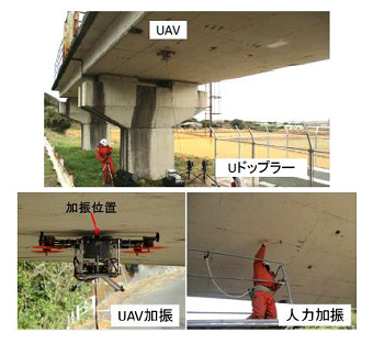 実橋りょうの桁下面を対象として、弾性波速度推定手法の検証試験を実施しました。図7に対象橋りょうと測定・加振状況を示します。比較のため、人力加振による調査も行いました。発生させた衝撃弾性波を2台のUドップラー(速度レンジ2mm/sec/V、サンプリング周波数100kHz)で測定し、測定点間の距離を順次10cmずつ遠ざけて、UAV、人力加振ともに計10ケースの測定を実施しました。