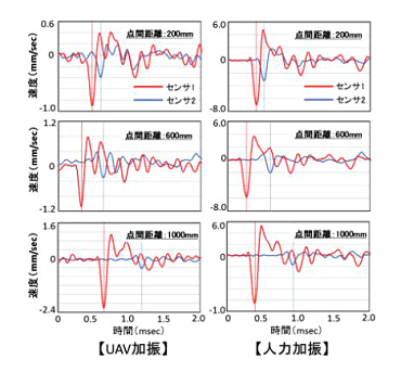 図8に提案手法による衝撃弾性波の測定波形例を、人力加振結果と合わせて示します。UAV加振による弾性波は、人力加振と比較してその振幅が小さく、ばらつきもみられますが、その微小な弾性波を長距離型Uドップラーで非接触かつノンターゲットで計測でき、2点間距離10cm~100cmの測定点の2点同期計測で得られた走時から2点間の到達時間差を検出できました。図9に2点間の距離と弾性波到達時間差の関係を示します。2点間距離と弾性波動の到達時間差は正比例関係にあり、その傾きから推定した実橋りょうの桁下面コンクリートの弾性波速度は1.85km/secで、人力ハンマー加振による測定結果との誤差は2.2%でした。