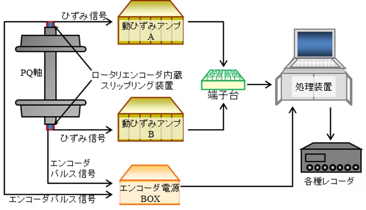 PQ測定には,使用するセンサやセンサの設置場所などの違いにより,いくつかの手法があります。このうち,車輪にひずみゲージを貼付しロードセル化した輪軸すなわちPQ軸をセンサとして用いるPQ測定の手法のひとつに新連続輪重横圧測定法1)(以下,新連続法と記す)があります。新連続法は,今から約30年前に鉄道総研が開発した測定手法です。PQ軸から得られたひずみ信号を演算処理することで,輪重や横圧の連続的な測定を可能としています。他の手法とは異なり,輪重や横圧を連続的に精度良く測定できることから,国内外を問わず多くのPQ測定の場で活用されています。この連続的な測定は,専用の測定システムを構成する2つの核技術すなわち処理装置とロータリエンコーダ内蔵スリップリング装置(以下,スリップリング装置と記す)により実現しています(図2)。このうち,処理装置は輪重や横圧を連続化する処理を行なう一種の演算装置で,スリップリング装置は連続化演算に必要な車輪回転角を検知するロータリエンコーダを内蔵したデータ伝送装置です。