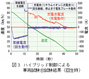 電圧1500Vにおける実モータ1台による100km/hまでの車両試験台試験、トラム級試験電車による750V集電における速度50km/hまでの所内走行試験により、ハイブリッド制御による力行時や回生ブレーキ作動時における架線電圧の遮断/復帰時の挙動、架線電流上限値設定下での力行・回生性能、パンタグラフ下降/上昇時の挙動等といった異常時の対応特性の確認を行いました。その結果、架線との間で授受できなくなった電気エネルギーは車載充電池に蓄えられ、エネルギー分担変更を行いながら、このような異常時にも円滑に加速および減速を継続できることが分りました(図3)。また、所内走行試験時の50km/hからのブレーキエネルギー回収率は約70%でした。