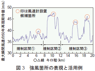本方法で得られる鉄道沿線での最大瞬間風速再現期待値の分布図を用いれば、強風時の運転規制区間と規制用風速計の設置箇所とを検討することができます(図3)。