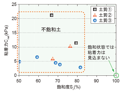 そこで、降雨の影響を受ける盛土内部の含水状態を実盛土の長期計測により検証しました。盛土内部では間隙に水と空気が混在した不飽和状態が維持されることや、浸透流解析によって挙動を再現できることを確認しました(図1)。また、不飽和状態を考慮した盛土材料の力学試験を多数実施したところ、飽和状態での試験と比較して粘着力が増加することがわかりました(図2)。