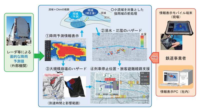 本システムにより、ゲリラ豪雨時の運転規制判断の支援や旅客の避難場所、経路の把握に資する情報が得られ、安全性を高められます。