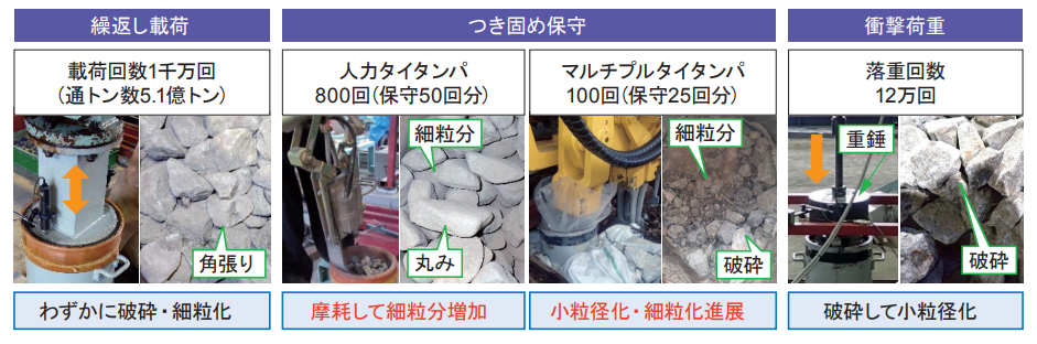 そこで、列車荷重を想定した繰返し載荷試験、タイタンパおよびマルチプルタイタンパを用いたつき固め試験、並びにレール継目部等で生じる衝撃荷重を想定した衝撃載荷試験を実施し、破砕・細粒化が生じる要因を明らかにしました。